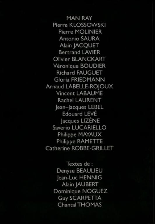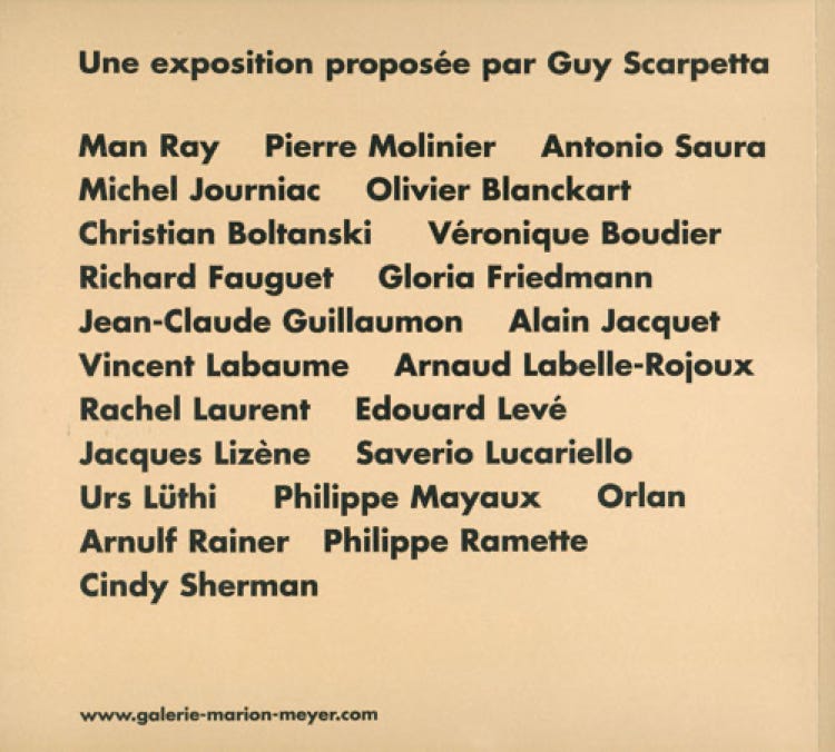 Artistes: Man Ray, Pierre Molinier, Olivier Blanckart, Véronique Boudier, Richard Fauguet, Gloria Friedmann, Alain Jacquet, Vincent Labaume, Arnaud Labelle-Rojoux, Bertrand Lavier, Rachel Laurent, Edouard Levé, Jacques Lizène, Saverio Lucariello, Philippe Mayaux, Philippe Ramette, Alberto Sorbelli